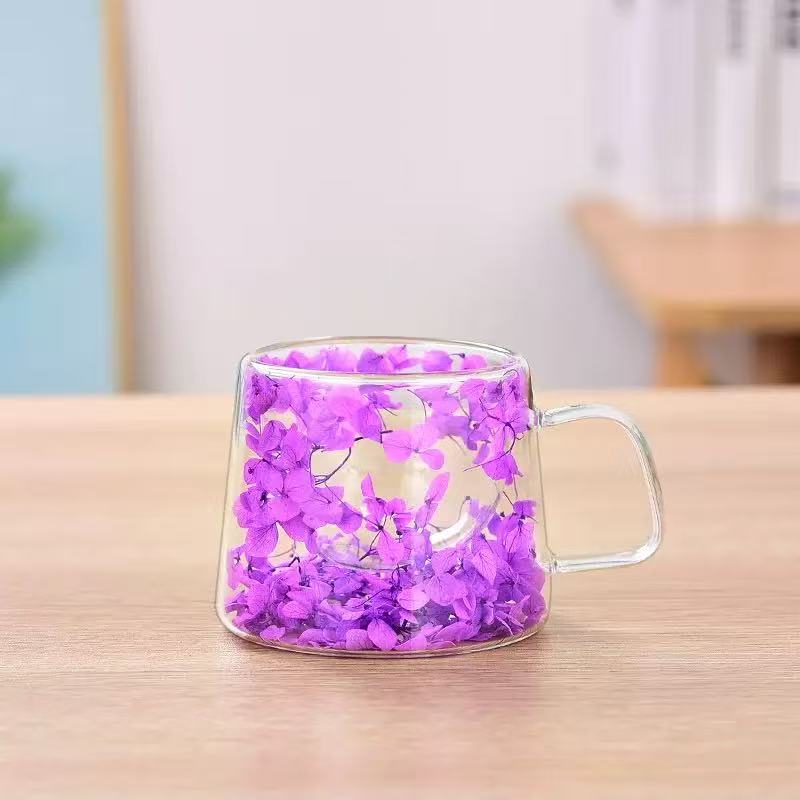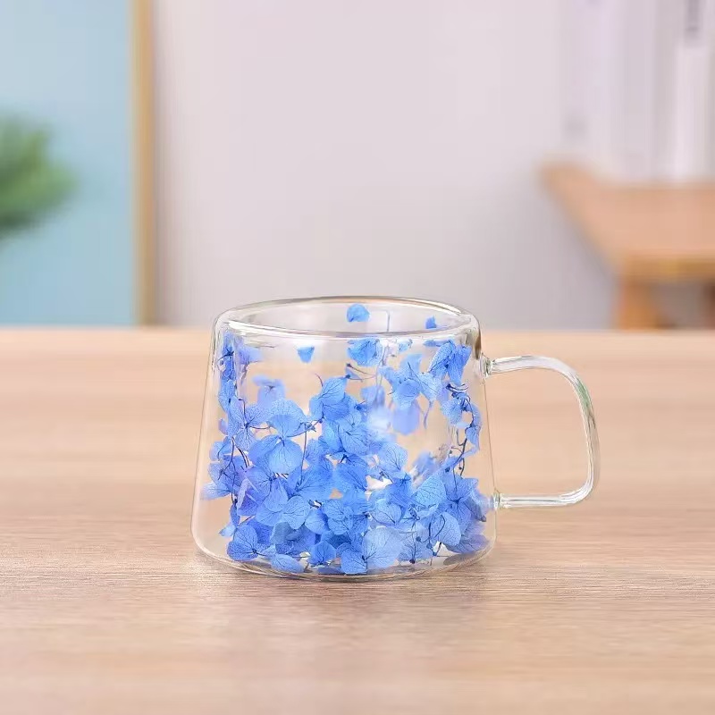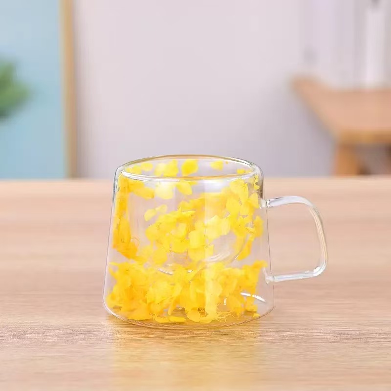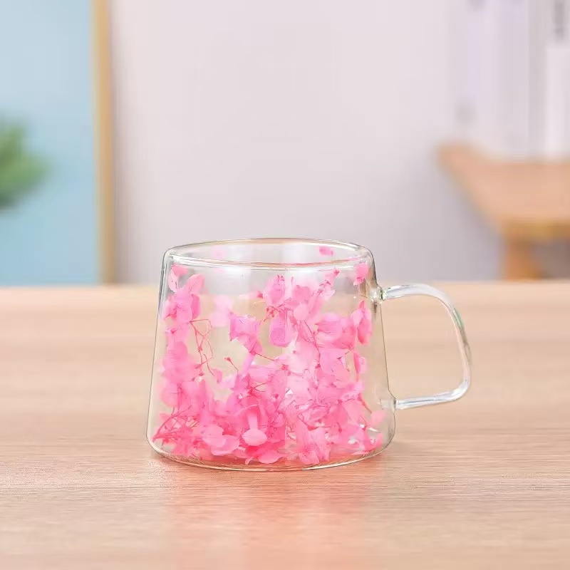 Double layered glass cup with high aesthetic value, coffee cup with handle, creative flowers and plants